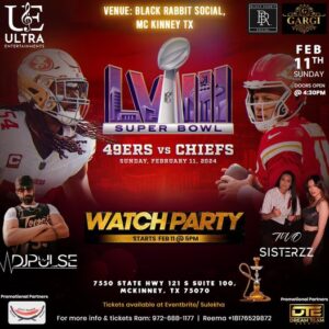 Call chill people 817-652-9872. Get your tickets before they are gone. – join the hype with DJ Pulse at our exclusive watch party! Secure your tickets now for a night of pulsating beats, electrifying energy, and unforgettable touchdowns. Limited seats available, so don’t miss out on the ultimate Super Bowl celebration. Get your tickets fast and let the party begin! #SuperBowlParty 🏈 #DJPulseExperience 🎧 #WatchPartyVibes ✨ #GetYourTicketsFast 🎟️ #TouchdownCelebration πŸ™Œ #LimitedSeats πŸ”₯ #UltimateFanExperience #chillpeoplepartiesandevents